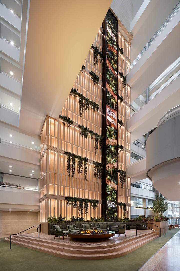 Evoking a Zen, otherworldly natural landscape, the refreshed space includes tree-like columns at the Yonge Street entrance, a reflecting pool, a vapor-based fire pit, hanging moss pendants, plenty of greenery and new seating, as well as a trellis that wraps the elevator bay, anchors the screen and preserves the original Travertine wall.