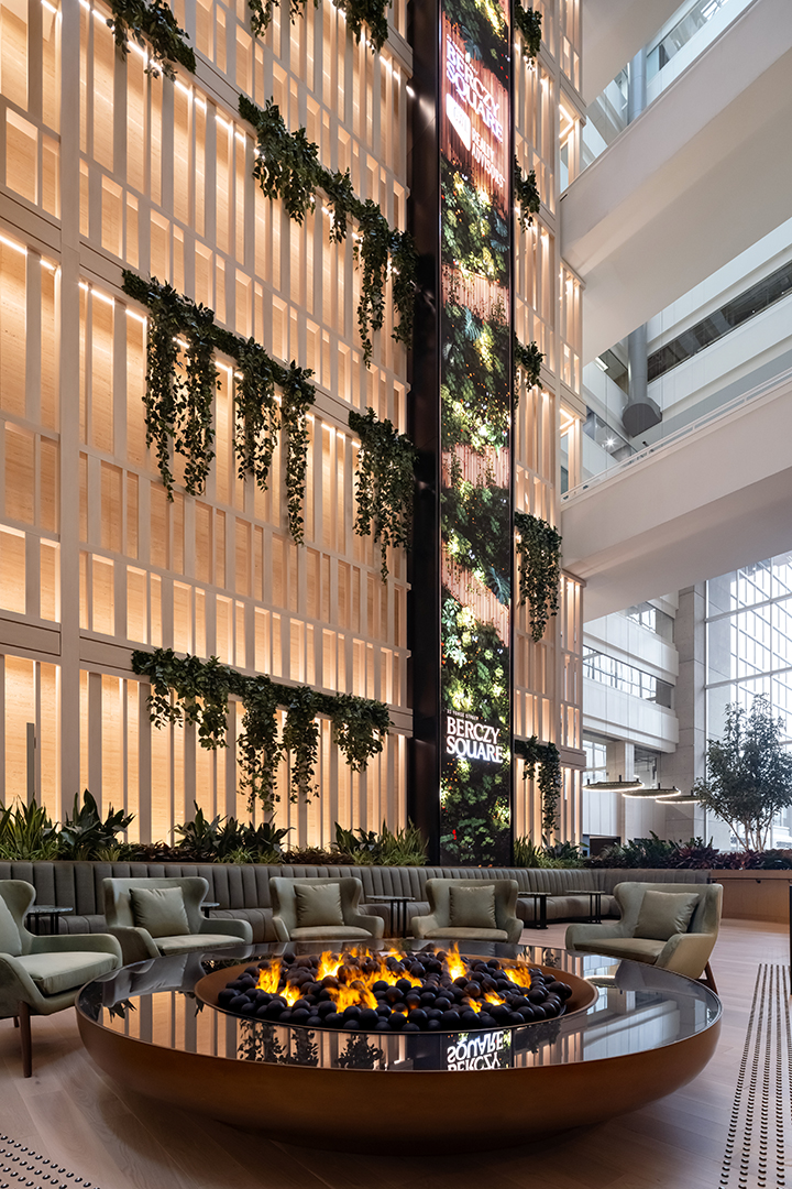 Anchored by a monumental 90-foot LED screen displaying atmospheric digital art, the reinvigorated design encourages office workers and the wider community to slow down, linger and look up at the 13-storey building’s landmark atrium architecture.